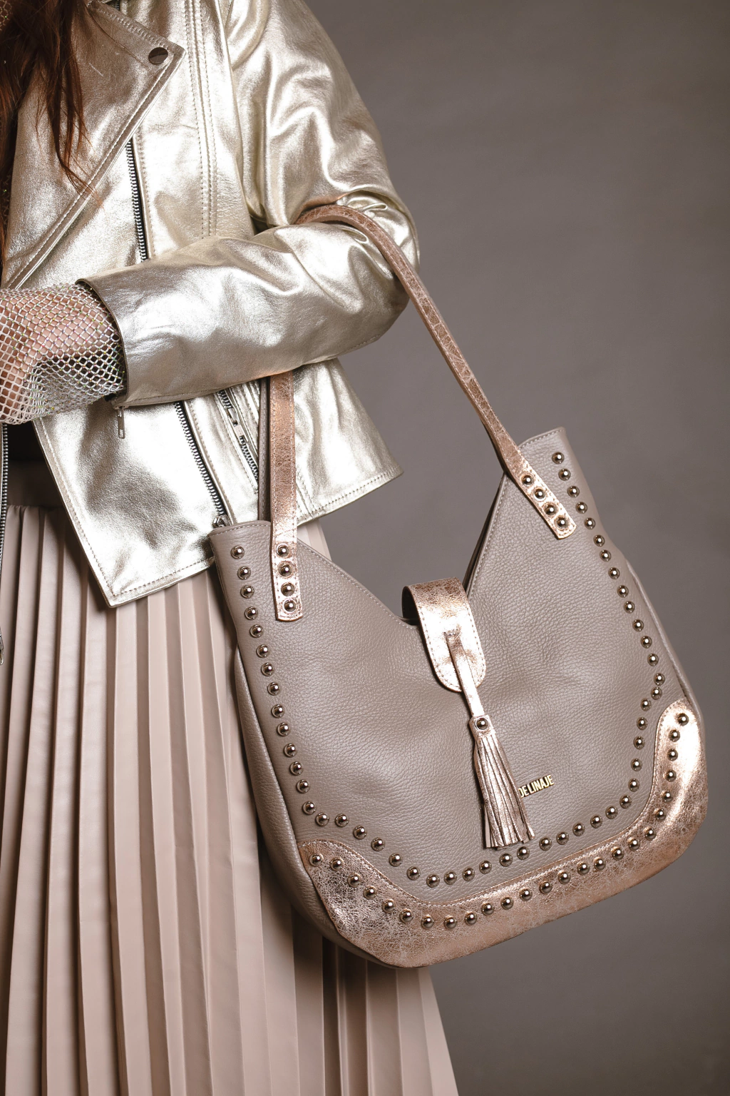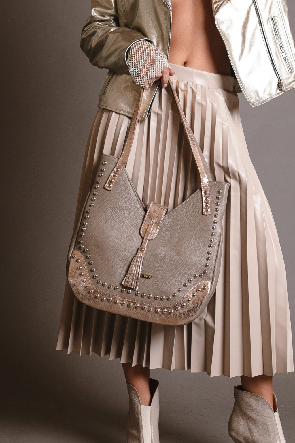 Este bolso destaca por su diseño en dos tonos, combinando un cálido color suela con detalles en negro charolado . Adornado con tachuelas metálicas que le añaden un toque atrevido y moderno, es el complemento perfecto para cualquier outfit.